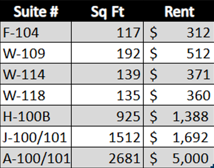A-101 is a 266 SqFt space attached to A-100. It can be utilized as an office, conference room, or storage space. A-100 and A-101 are 2,681 total SqFt and they rent together for $2,681/month.